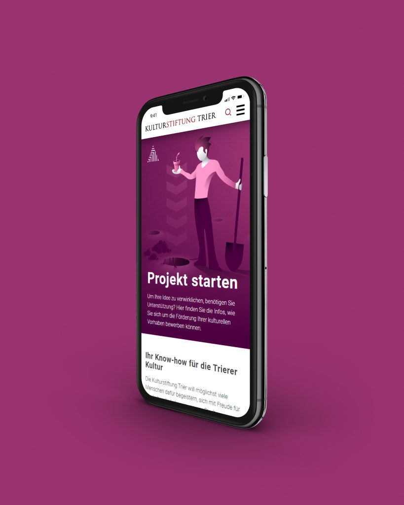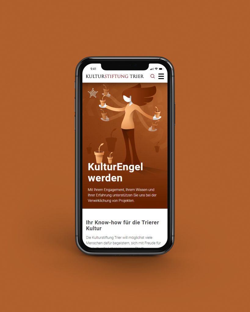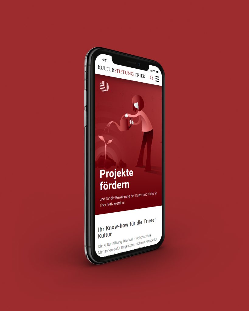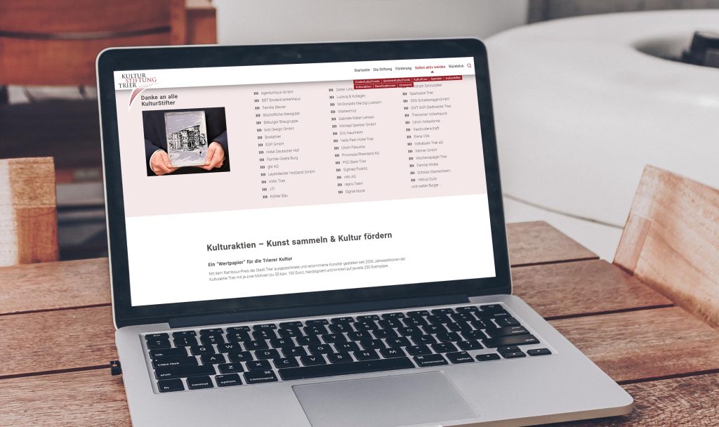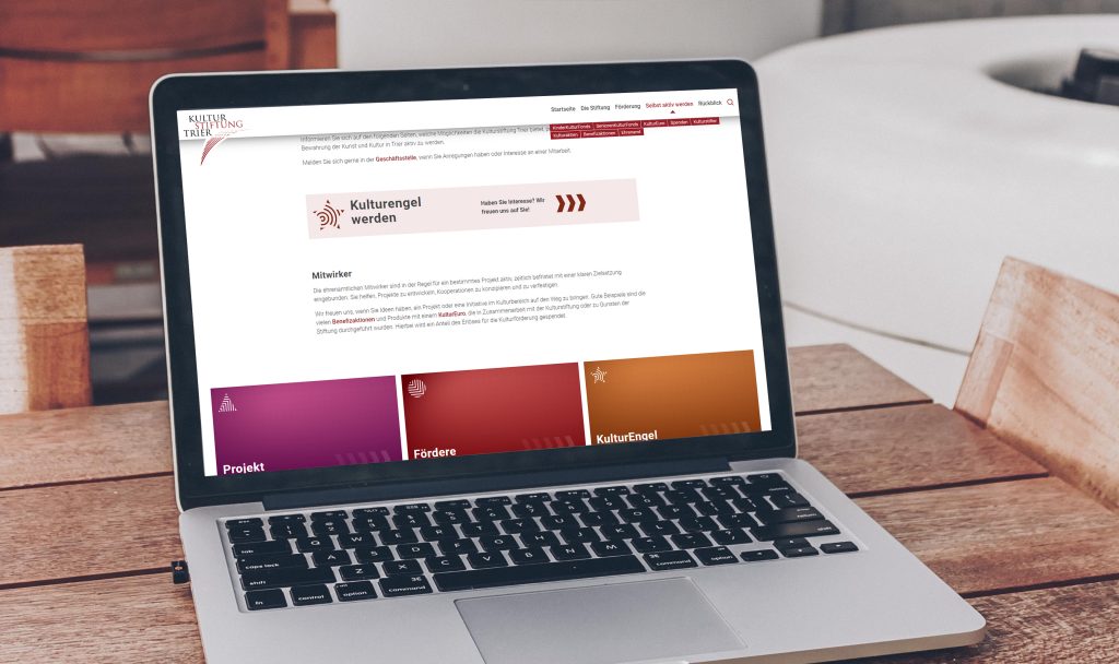 Förderung der Kunst und Kultur in Trier: Ziel unseres Kunden „Kulturstiftung Trier“ und Herzensangelegenheit für uns als kreative Kommunkationsagentur. Zur Erreichung dieses Ziels trägt nun auch der neue Webauftritt der Kulturstiftung bei, der als Anlaufstelle für Kulturschaffende als auch Unterstützer dient. Zur Entwicklung der neuen Webseite gehörte die Konzeption, das Webdesign und die Programmierung. So wurden die Internetseite und deren Inhalte neu strukturiert und ansprechender gestaltet. Die moderne Farbgestaltung und neue Illustrationen erleichtern die Navigation im Hinblick auf ein modernes UX-Design.